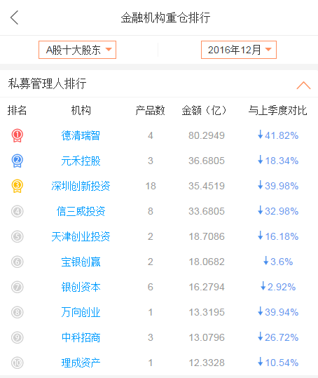 点击“机构排行”,我们首先能够看到A股流通股东排行,如果我们想看下私募管理人机构的A股十大股东排行情况,我们可以点击页面上方的左侧按钮,选择“A股十大股东”,相关排行与变化趋势就展示出来: