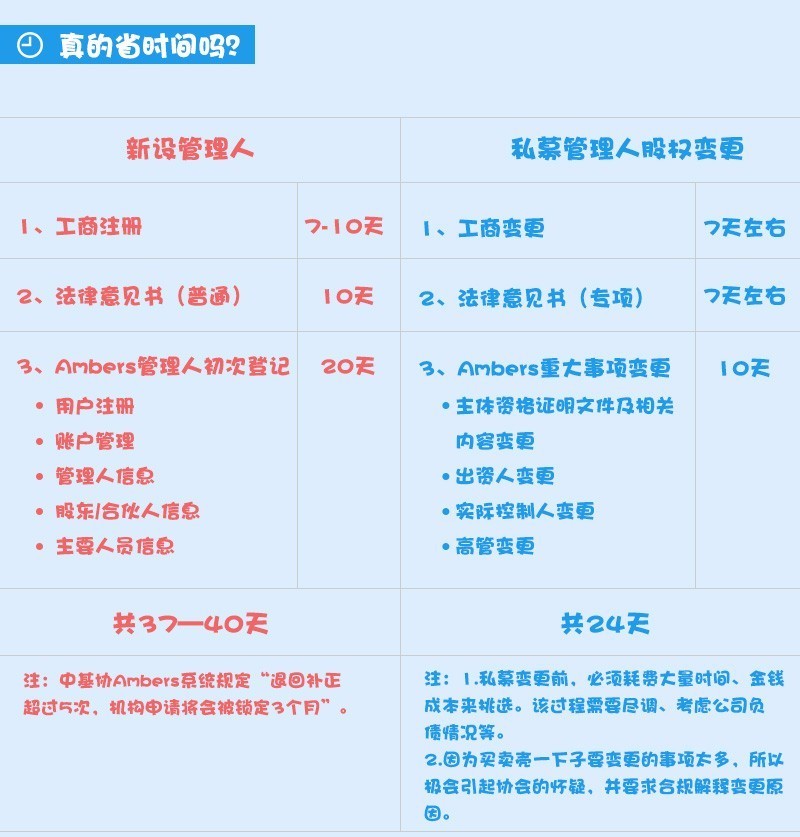 一般情况下,两种场景:新设管理人vs私募管理人股权变更,办理的时间比较如下: